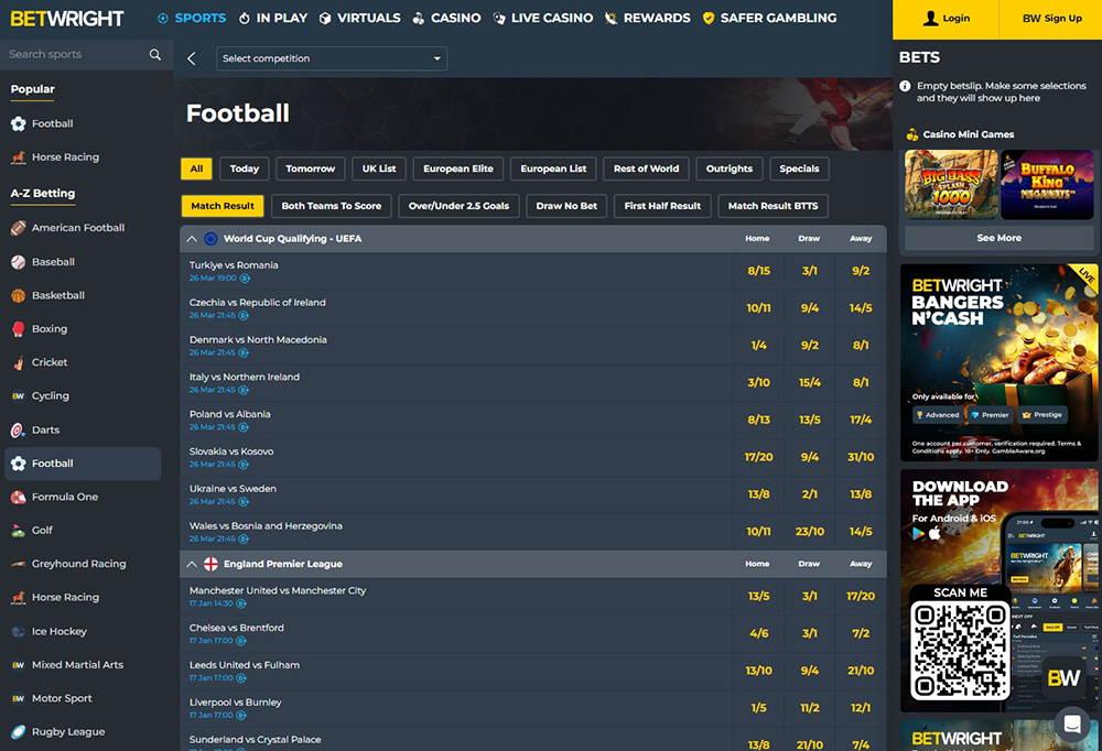 If you love betting on the beautiful game, then you can add BetWright UK to your shortlist of solid football betting site. options. UK punters can bet on the Premier League, Championship and League 1. Also, it’s possible to wager on all markets from outright to handicaps and correct score. From time to time, there are also odds boosts and bet builder opportunities.