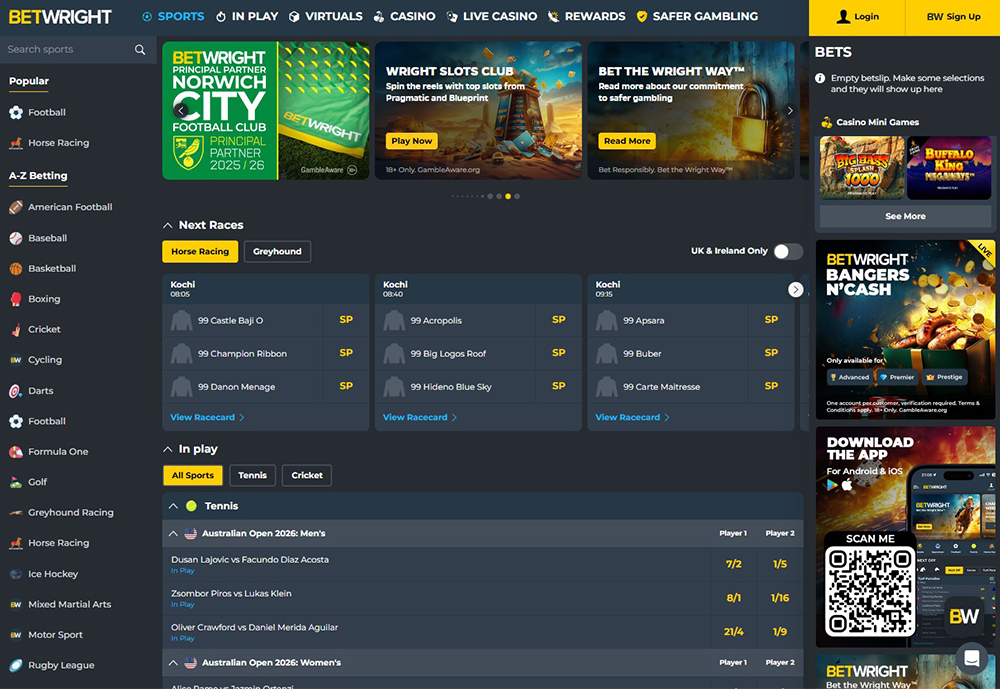 British punters can bet on all four Grand Slams at BetWright on both the men’s and women’s games. In addition, you’re able to enjoy the season all year round, with the ATP and the WTA. In all tennis matches, you can bet on a wide range of markets from set betting and handicaps to correct score. The offering is fine but the lack of specials and promos leaves BetWright somewhat behind the leading online tennis bookmakers we have identified.