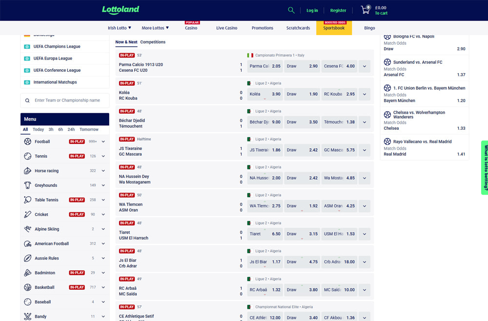 If you’re watching a sport and think something is going to happen next, then at Lottoland you’re able to bet in-play. Click the “In-Play” tab at the top of the page, and all the available events will appear. You can even click the streaming toggle button to show sports you can live stream. In the live betting section, you can switch between sports or click on popular events like the UEFA Champions League or Europa League.
