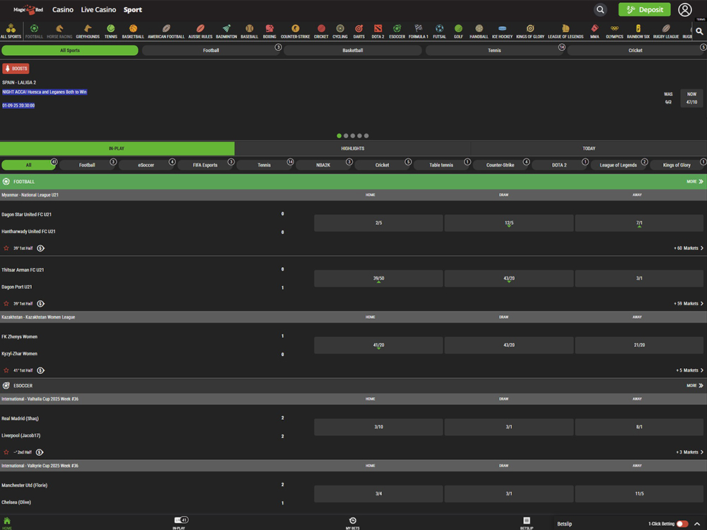 In our opinion, football betting at Magic Red is up there with the best football betting sites. You can bet on most major international events, like the Champions League, as well as domestic leagues.