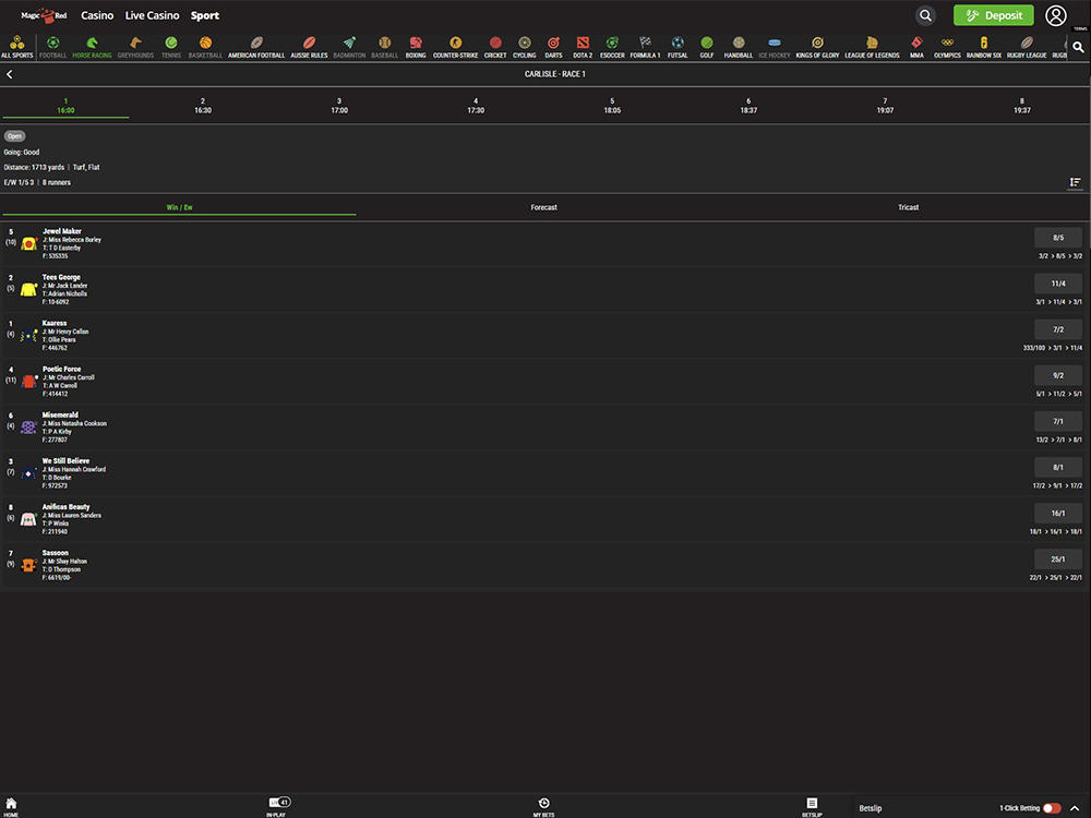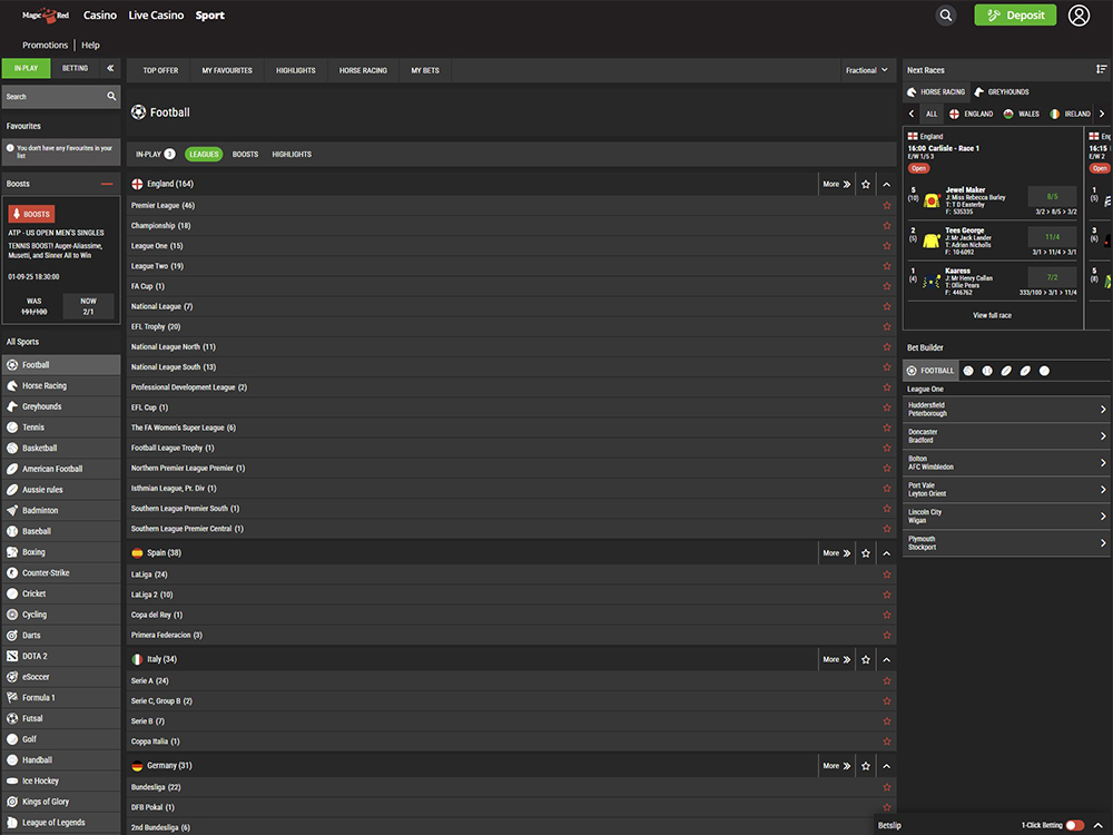 With over 40 sports to bet on, Magic Red can be considered a top UK betting site. The platform features popular sports such as football, horse racing, and tennis, as well as less common options such as darts and floorball. You will find useful features, such as the in-play betting option and early cash-out.