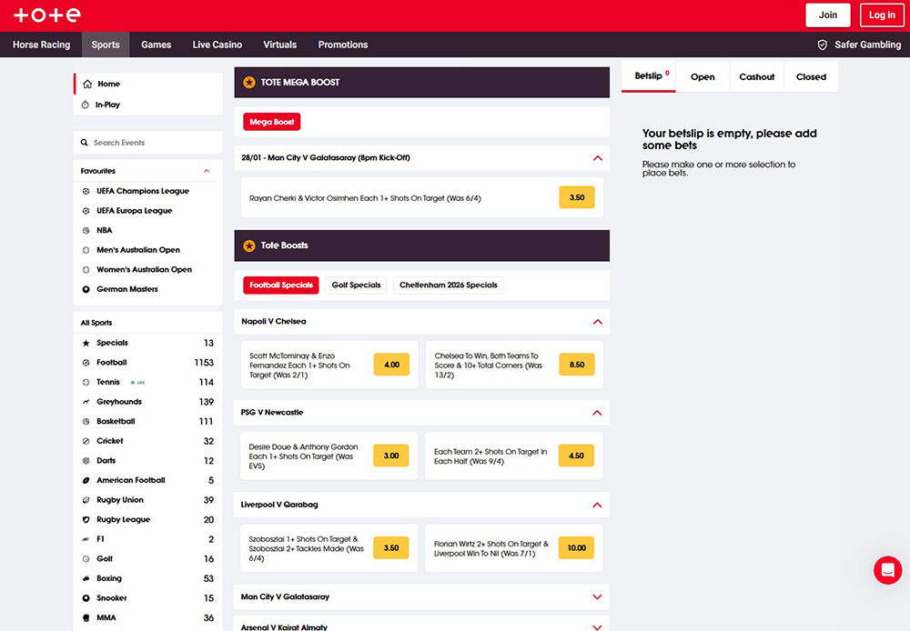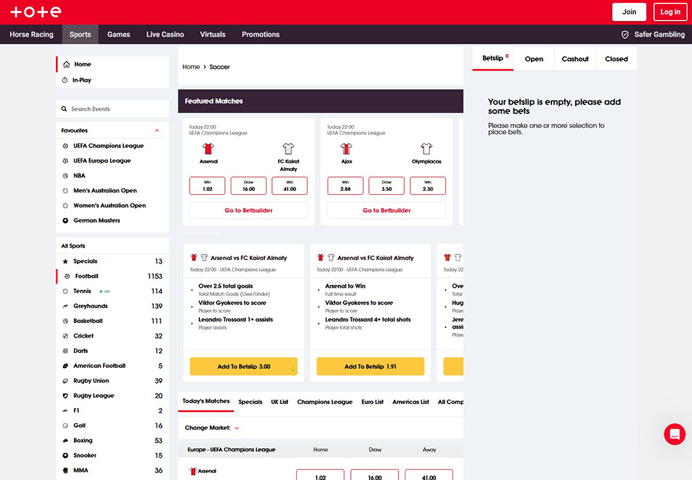 Although it doesn’t quite rank as one of the top football betting sites in the UK, Tote still provides a solid football betting experience. It offers extensive markets across major UK and European leagues, including Premier League and Champions League fixtures, with options such as match result, total goals, correct score, and a wide range of specials.
