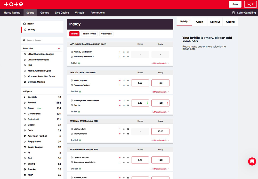 Tote offers an in-play betting section, allowing you to place your bets live while the match or event is underway. Click the ‘in-play’ tab to find available sports, including football, tennis, basketball, cricket, table tennis, and volleyball. Tote is also a live betting site that lets bettors view UK and Irish horse racing events live.